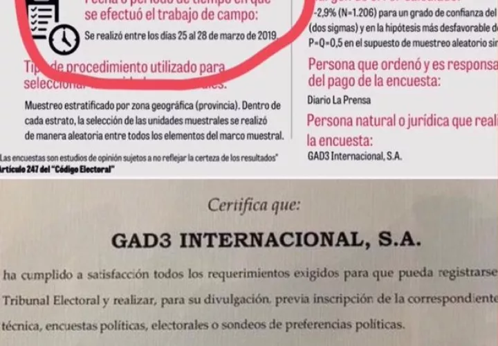 La encuesta de la empresa GAD3 Internacional, contratada por La Prensa, levanta suspicacias, como que el medio de comunicación publicó los resultados el 2 de abril, pero la certificación del Tribunal Electoral de que se cumplieron los requisitos para divulgar el trabajo se dio al día siguiente.