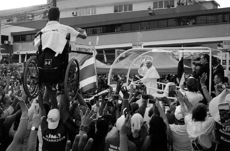 Carlos Yap tomó la gran foto de la visita de Francisco a Panamá. La imagen tomada en blanco y negro capta a Lucas, un joven de 17 años que participa en la parroquia Inmaculada Concepción de La Chorrera, Panamá, y que es alzado en su silla de ruedas por sus amigos para que pueda ver pasar al santo padre en su papamóvi.