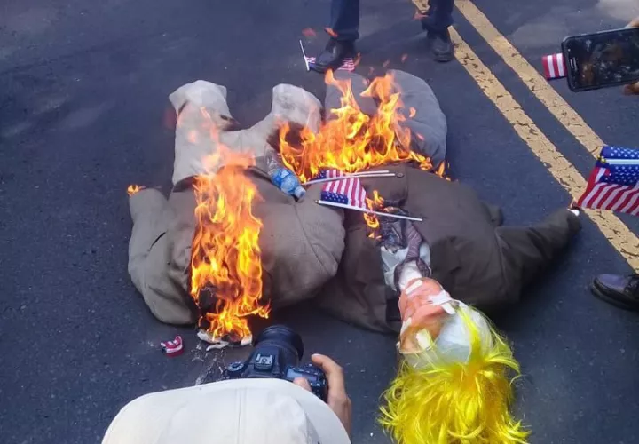 Agentes de la Policía Nacional formaron una barrera frente al portón principal de la embajada americana, mientras miembros del Suntracs y Frenadeso quemaron muñecos que simbolizaban al fallecido presidente que ordenó la invasión, George H.W. Bush, y el actual mandatario estadounidense, Donald Trump.