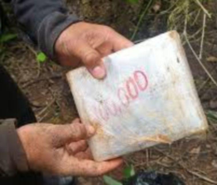 El 12 de diciembre fue descubierto ese tesoro de narcos. Los fajos de billetes en efectivo estaban embalados en canecas o tanques plásticos enterrados. Habían al menos 9 fajos de billetes de $100; 9 fajos de billetes de $50 y 15 de billetes de a $20.