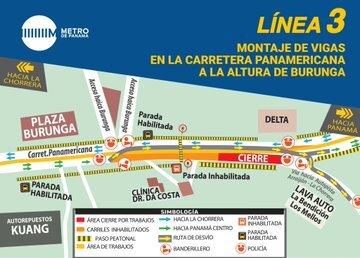 El Metro de Panamá, a través de un comunicado de prensa, informan que se realizará los trabajos del montaje de vigas de la Línea 3 en la carretera Panamericana, a la altura de Burunga, distrito de Arraiján, desde este sábado hasta el próximo miércoles 16 noviembre , en horario de 10:00 p.m. hasta las 4:00 a.m.