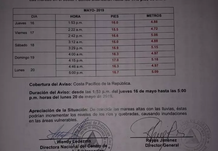El Sistema Nacional de Protección Civil (Sinaproc) emitió un aviso de prevención por altas mareas que alcanzarán 17 pies de altura (5.8m) en el sector Pacífico de Panamá.