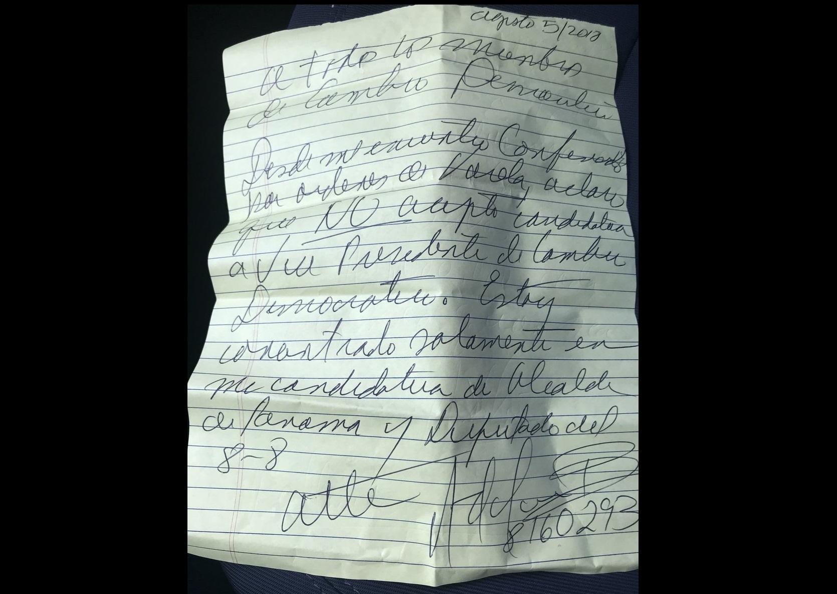 Panamá- “A todos los miembros de Cambio Democrático. Desde donde me encuentro confinado por órdenes de Varela, aclaro, que NO acepto candidatura a vicepresidente de Cambio Democrático. Estoy concentrado solamente en mí candidatura a alcalde de Panamá y diputado del 8-8”, este el contenido de la nota manuscrita, firmada por el expresidente Ricardo Martinelli, que se hizo publica este domingo”.