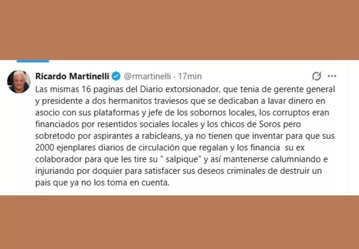 En su publicación, Martinelli arremete contra lo que llama un “diario extorsionador”, al que acusa de haber sido manejado por “dos hermanitos traviesos” que, según sus palabras, se dedicaban al lavado de dinero, en asocio con plataformas digitales y figuras a las que señala como jefes de sobornos locales.