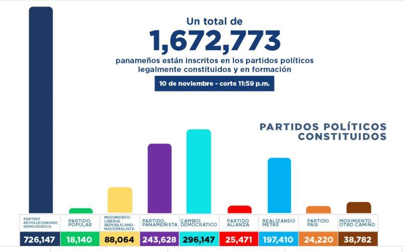 El documento refleja que el Partido Revolucionario Democrático (PRD) tiene 726,147 miembros; Cambio Democrático (CD), 296,147; el Partido Panameñista, 243,628; Realizando Metas (RM), 197,410; Movimiento Liberal Republicano Nacionalista (Molirena), 88,064; Movimiento Otro Camino (MOCA), 38,782; Partido Alianza, 25,471; Partido Alternativa Independiente Social (PAIS), 24,220; y el Partido Popular (PP) cuenta con 18,140 inscritos.