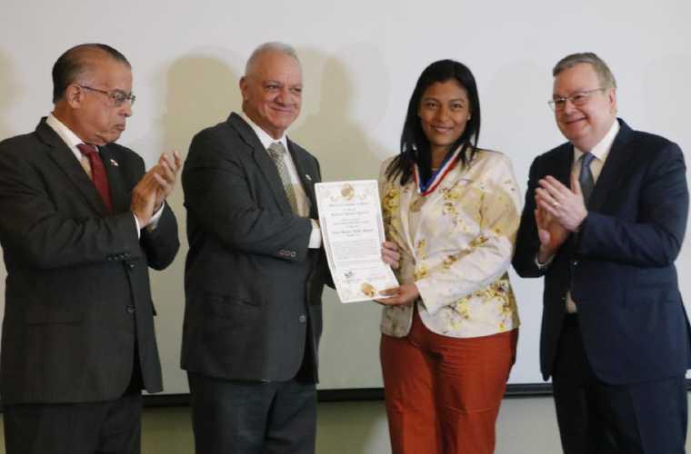 Aymeé Valdés Márquez recibió la Medalla “Arturo Donaldo Melo Sarasqueta”, durante un actoliderado por el ministro de Desarrollo Agropecuario, Augusto Valderrama en compañía del ministro consejero para Asuntos Agropecuarios, Carlos Salcedo.