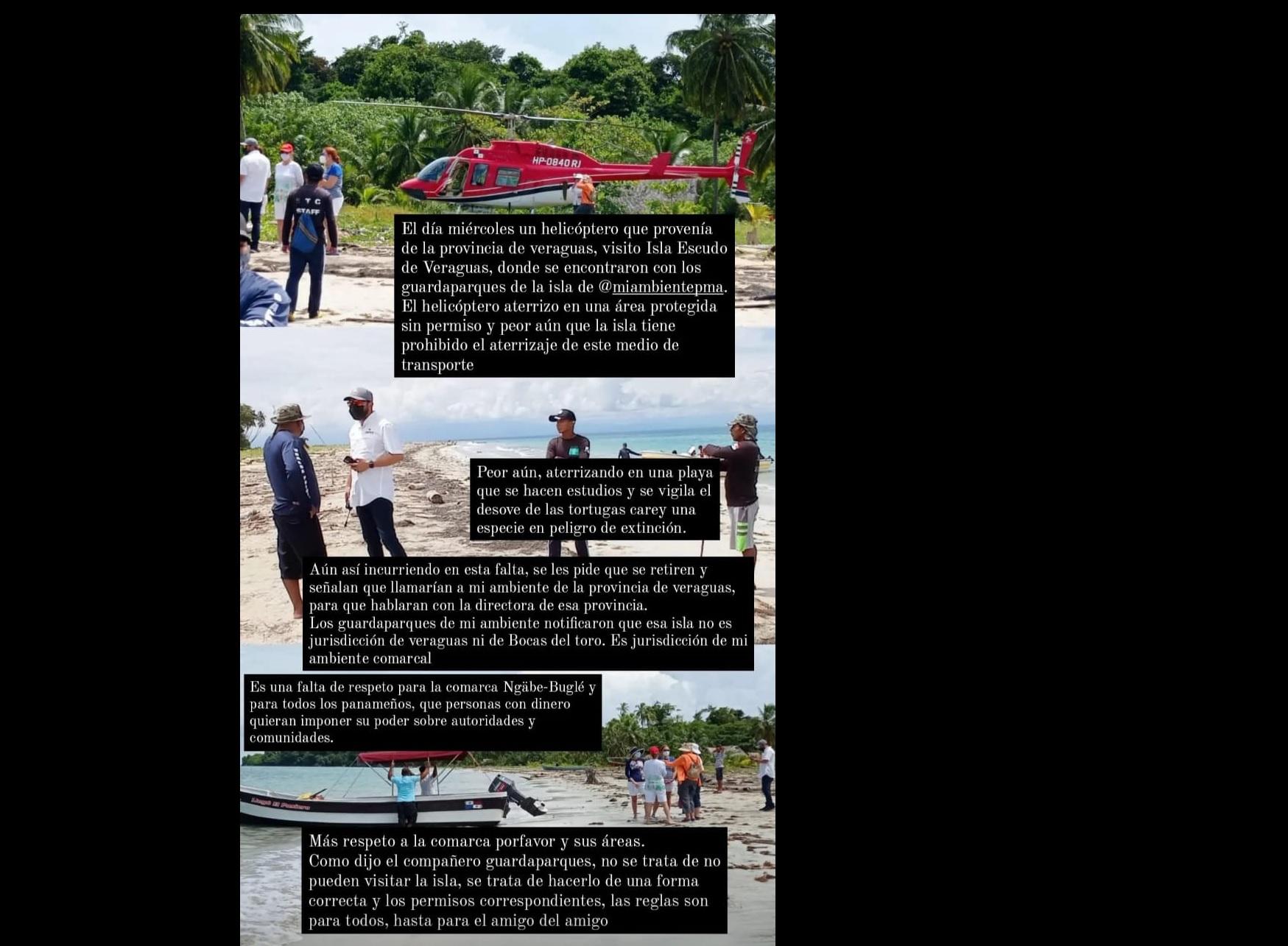 De acuerdo con la información que se tiene, un grupo de personas hizo aterrizar un helicóptero que provenía de Veraguas en una playa de la isla Escudo de Veraguas y allí se encontraron con guardaparques, quienes les hicieron saber que existían disposiciones que prohíben el aterrizaje de naves aéreas en ese lugar.