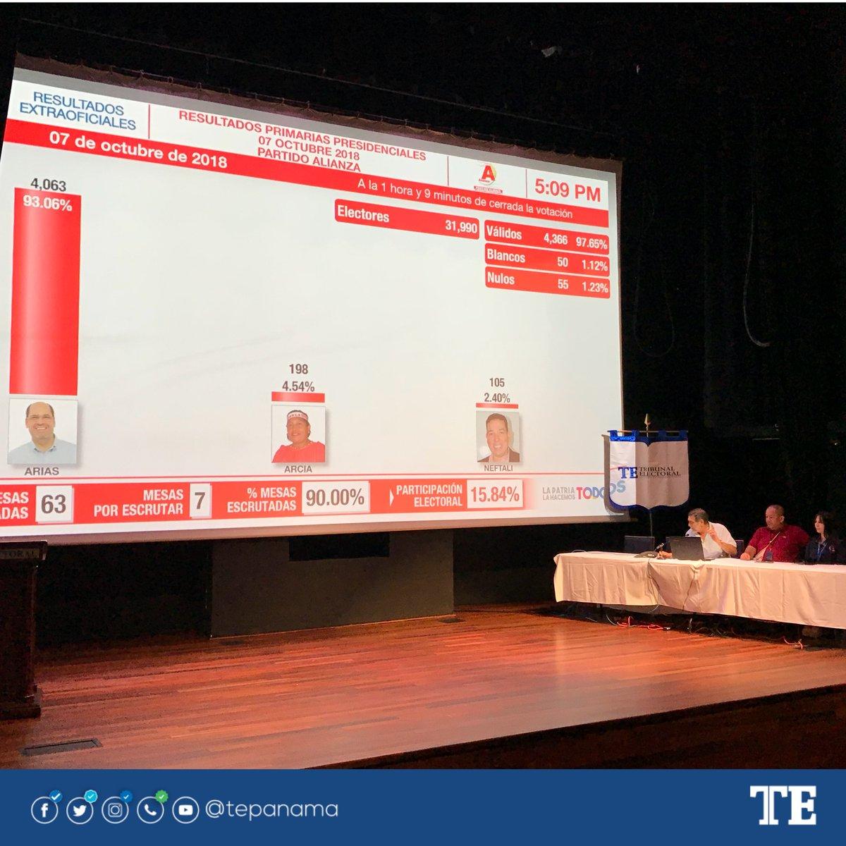 José Domingo 'Mimito' Arias, fue declarado por el Tribunal Electoral (TE) como virtual ganador de las primarias presidenciales del Partido Alianza, al alzarse con con 4,063 votos, frente a los precandidatos Lara Arcia (198) y Neftalí Jaén (105) con el 90% de mesas escrutadas.