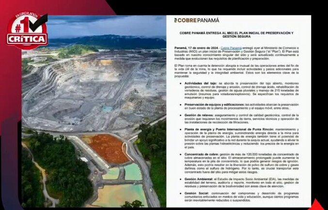 La empresa Minera Panamá entregó al Ministerio de Comercio e Industrias (MICI) un plan inicial de preservación y gestión segura ante el cese de operaciones de la mina.