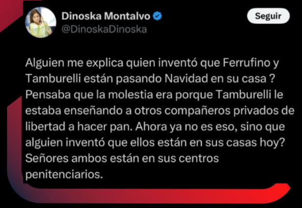 La ministra de Gobierno, Dinoska Montalvo, salió al paso de las especulaciones que han circulado en las redes sociales, asegurando que tanto el exministro Guillermo Ferrufino como el exdirector Giacomo Tamburrelli siguen cumpliendo su condena en sus respectivos centros penitenciarios.