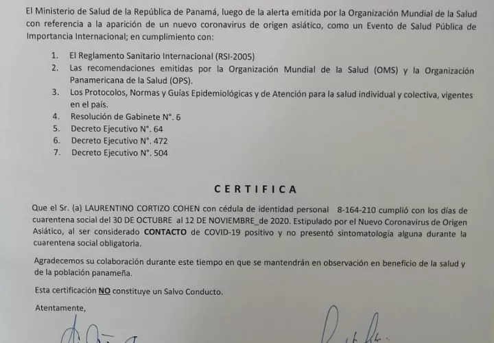 El mandatario Laurentino Cortizo compartió la certificación de fiel cumplimiento de la cuarentena por un contacto COVID19 positivo cercano. Cortizo resultó negativo en la prueba de hisopado, sin embargo, decidió cumplir con la cuarentena exigida por las autoridades del Ministerio de Salud.