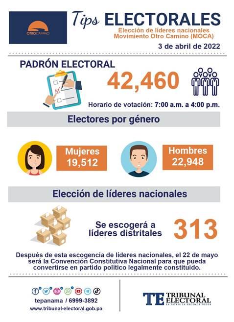 Un total de 42,460 miembros del partido en formación Movimiento Otro Camino (MOCA) están habilitados para elegir a 313 líderes nacionales este domingo 3 de abril de 2022, en unas votaciones internas financiadas y organizadas por el Tribunal Electoral (TE).