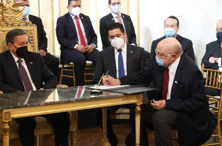 En el Salón Amarillo de la Presidencia de la República, el gobernante acompañado de de diputados, así como de Nicolás Ardito Barletta y Luis Roca, Secretario Ejecutivo y presidente, respectivamente, de la Junta Directiva de la SBP.