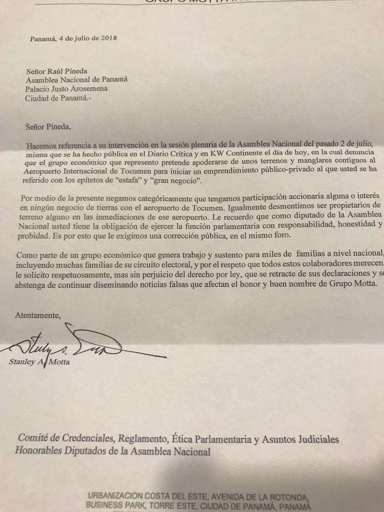 El empresario Stanley Motta negó las acusaciones hechas por el diputado Raúl Pineda de que el grupo empresarial que lidera, Grupo Motta, busque apoderarse de tierras adyacentes al Aeropuerto Internacional de Tocumen, y le solicitó en una carta retractarse de estos señalamientos que hizo durante el pleno legislativo del pasado 2 de julio.