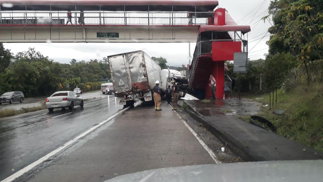 Los primeros informes extraoficiales indican que el conductor del camión articulado perdió el control del manejo en una curva cerrada y se chocó contra objeto fijo.