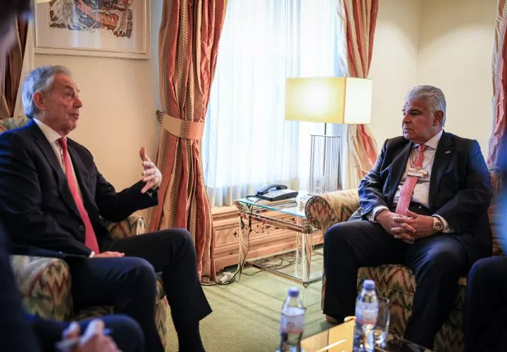 Tony Blair, ex primer ministro británico y actual fundador y presidente de la fundación y del Instituto Tony Blair para el Cambio Global bilateral, se reunió con el mandatario José Raúl Mulino, en Davos.