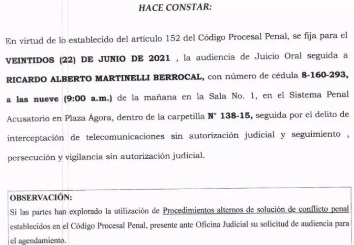Nada es casual. El sábado circuló un documento falso donde la Segunda Oficina Judicial de Panamá anticipaba para el 8 de abril el nuevo juicio por el caso pinchazos contra Ricardo Martinelli y el lunes se emite uno verdadero estableciendo la audiencia para el 22 de junio, lo extraño es que ambas citaciones son firmadas por el mismo funcionario.