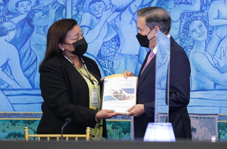 La representante de la Asociación Panameña de Magistrados y Jueces, Ruby de Ibarra, hizo la entrega a Cortizo y reconoció el esfuerzo del gobernante al convocar nuevamente a la Comisión para que evaluara a los aspirantes a magistrado.