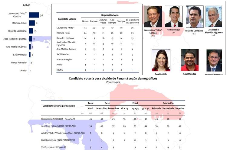 Para la alcaldía de Panamá, el exmandatario Ricardo Martinelli registra hasta mayor porcentaje de apoyo que los propios candidatos presidenciales al lograr el respaldo del 45% de los encuestados,