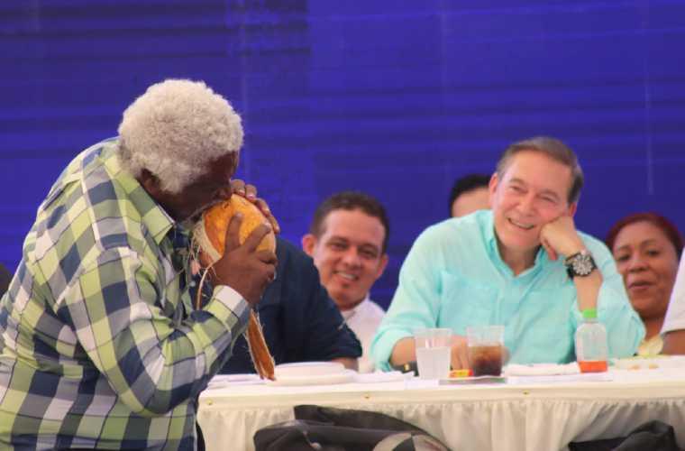 Ante la mirada atenta del gobernante, Gardin Delgado a máxima velocidad rebanaba con su dentadura la dura corteza del coco. Al terminar su labor, Cortizo exclamó: "¡wao¡", abrazó a Andrés y agarró el coco.