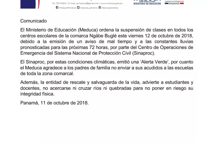 Panamá- El Ministerio de Educación ordenó hoy la suspensión de clases en todos los centros escolares de la comarca Ngäbe-Buglé.