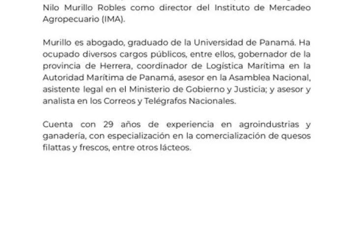 Por otra parte, Mulino también designó a Nilo Murillo Robles como director del Instituto de Mercadeo Agropecuario (IMA).
