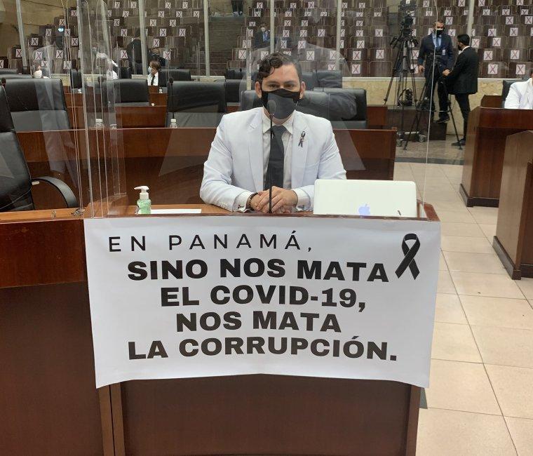 A lo interno, las curules estaban separadas por láminas protectoras transparentes; el diputado independiente Juan Diego Vásquez desplegó una pancarta con la leyenda: ¡En Panamá, si no nos mata el Covid-19, nos mata la corrupción!
