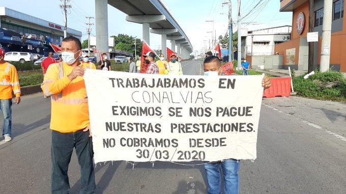 Trabajadores de la empresa constructora Conalvías protestan hoy a la altura de la estación del Metro de la 24 de Diciembre, para exigir el pago de prestaciones laborales adeudadas.