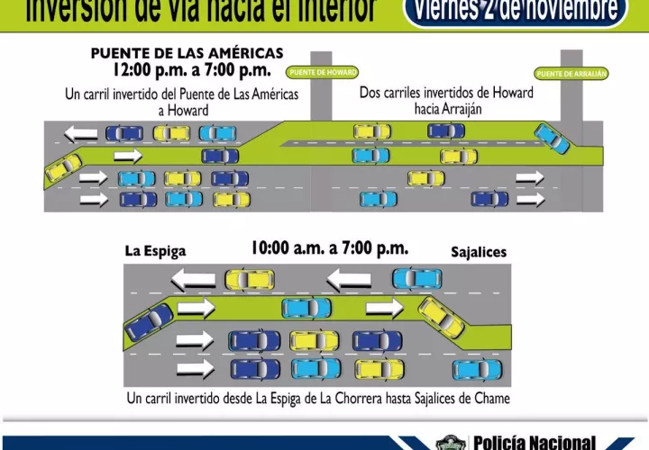 Herrera explicó que mañana, 2 de noviembre, será así: Puente de Las Américas a Howard un carril invertido; dos carriles invertidos desde Howard hacia Arraiján en horario de 12:00 p.m. a 7:00 p.m.