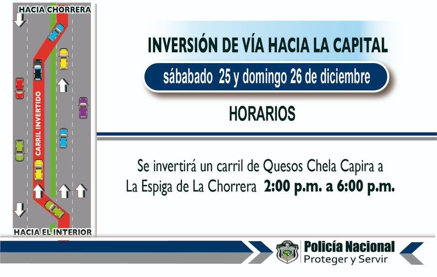 Panamá- Hoy, domingo en un horario de 2:00 p.m. a 6:00 p.m. se realizará la inversión de vías hacia la ciudad Capital, desde Quesos Chela en Capira hasta La Espiga en La Chorrera.