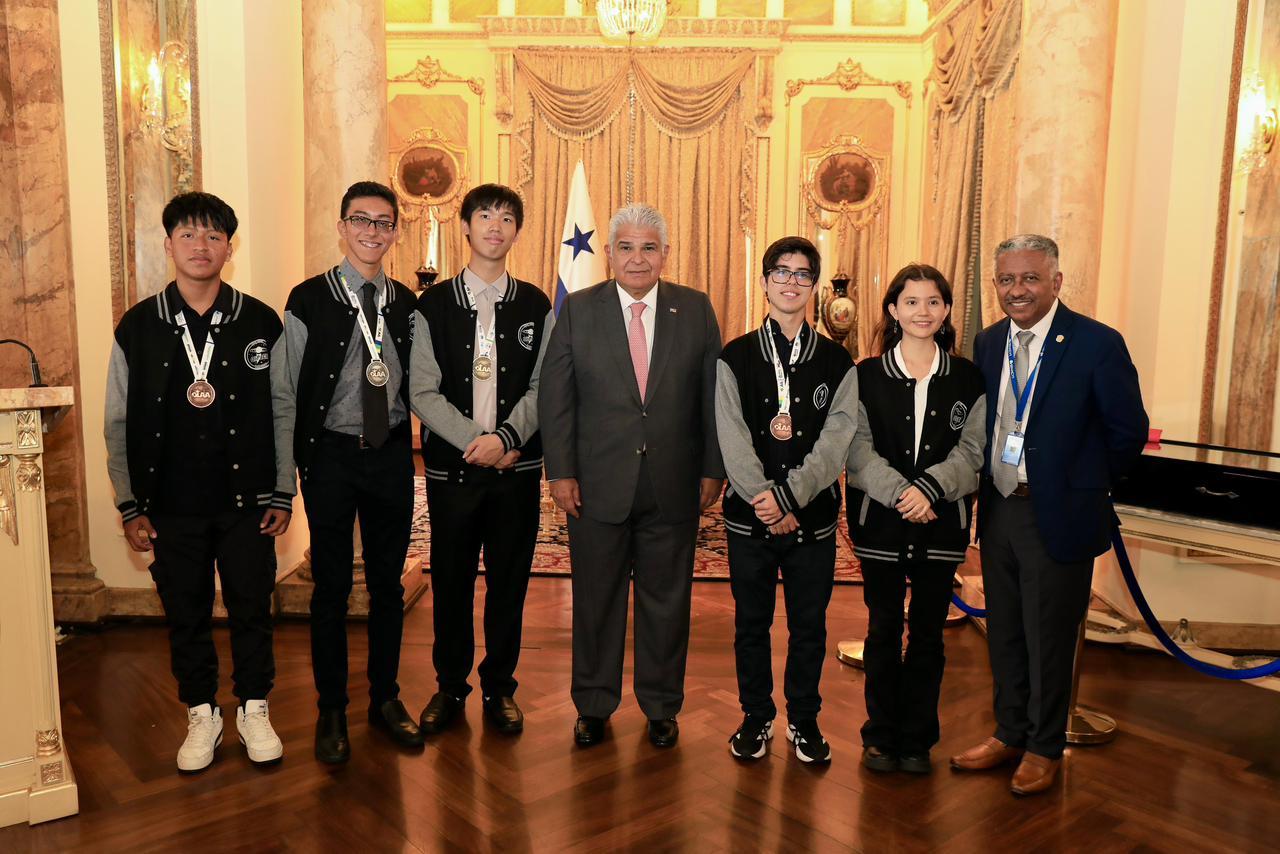 El acto se realizó en el Salón Amarillo del Palacio de Las Garzas, donde Mulino felicitó a los estudiantes Goten Loaiza, Ulises Peña, Toni Zhu, Jahir Zurdo y Valentina Rincón, quienes estuvieron acompañados por autoridades de la Senacyt, incluyendo a Eduardo Ortega Barría, María Heller, Arturo Pinilla y Kevin Amaya.