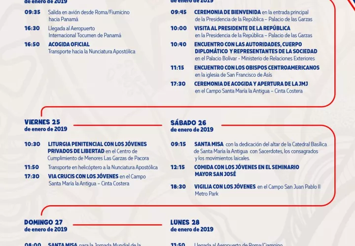 Allí a pocos metros, en la iglesia San Francisco de Asís, el papa tendrá el encuentro con los obispos centroamericanos que se extenderá por 6 horas con 15 minutos y a las 5:30 p.m. del jueves 24 de enero será la ceremonia de apertura de la Jornada Mundial de la Juventud (JMJ), en el campo Santa María La Antigua de la Cinta Costera.