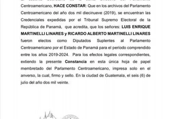 El Parlamento Centroamericano (Parlacen) emitió una "constancia" en la que certifica que los hermanos Luis Enrique y Ricardo Alberto Martinelli Linares poseen las credenciales oficiales como diputados suplentes desde el 2019 hasta 2024.