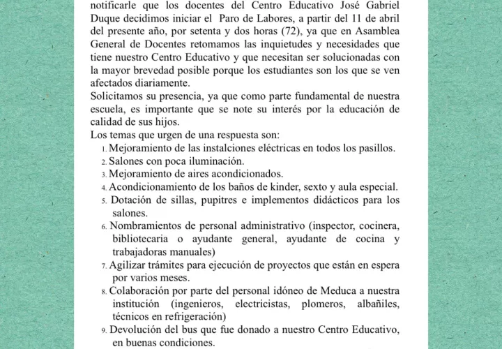 Panamá- A partir del lunes, 11 de marzo, los docentes del Centro Básico Educativo General (CEBG) Bilingüe, José Gabriel Duque, ubicado en Chepo, iniciarán un paro de labores de 72 horas.