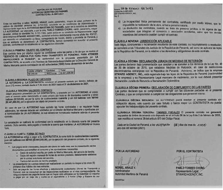 El primer contrato iba del 16 de junio hasta el 31 de diciembre de 2020, pagando la suma de 36,750.00 mensuales, a razón de 245 por hora, sumando $238,875 a la terminación del contrato, pero existía una cláusula en la que la AMP podía autorizar horas adicionales. Incluso, el contrato establecía en otra cláusula que el cálculo del pago será realizado de la siguiente manera: Total de horas consumidas (Pacífico + Atlántico) por tarifa contratada”. Dicho esto, no se conoce cuál fue el monto total que la entidad pagó por esos servicios.