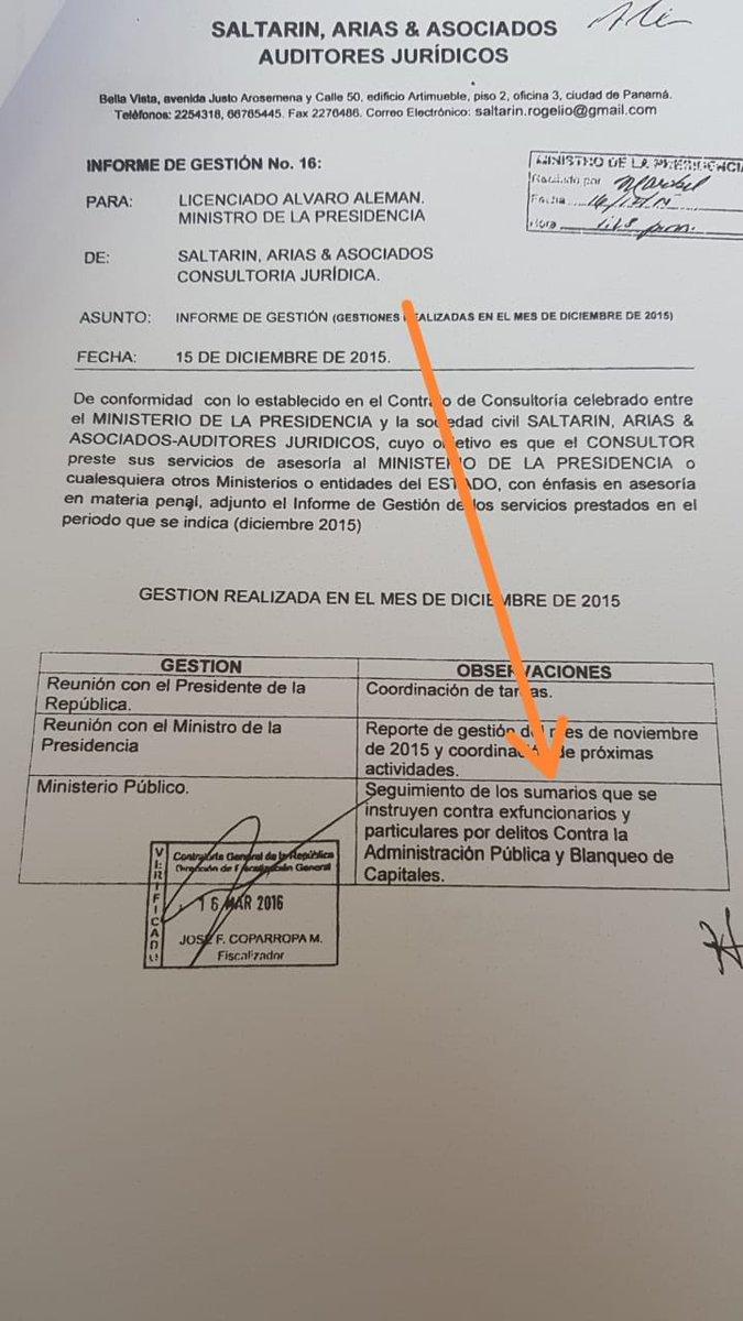 La prueba sería una serie de documentos divulgados por el diario “La Estrella de Panamá”, en los que se relata todo el esquema que montó Rogelio Saltarín, consultor privado y abogado del mandatario Juan Carlos Varela, quien tras un contrato por $385 mil 200 en 18 meses de gestión efectuó 153 reuniones con 29 instituciones del Estado para recabar material probatorio para las querellas penales que serían presentadas en la Procuraduría.