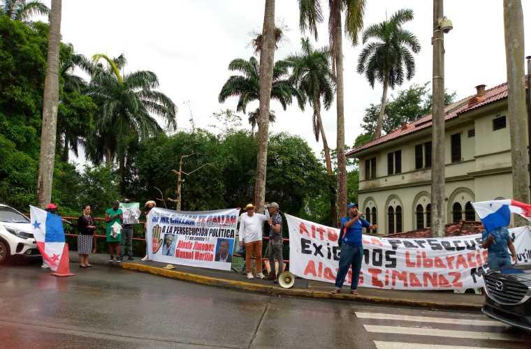 Un grupo de personas piquetearon ayer la sede de la Corte Suprema de Justicia para exigir la liberación de los excandidatos a diputados Alexis Jiménez Oliva y Manuel Murillo, detenidos en medio de una protesta en Viguí que frenó el avance de un convoy de camiones con comida que eran escoltados por miembros del Suntracs.