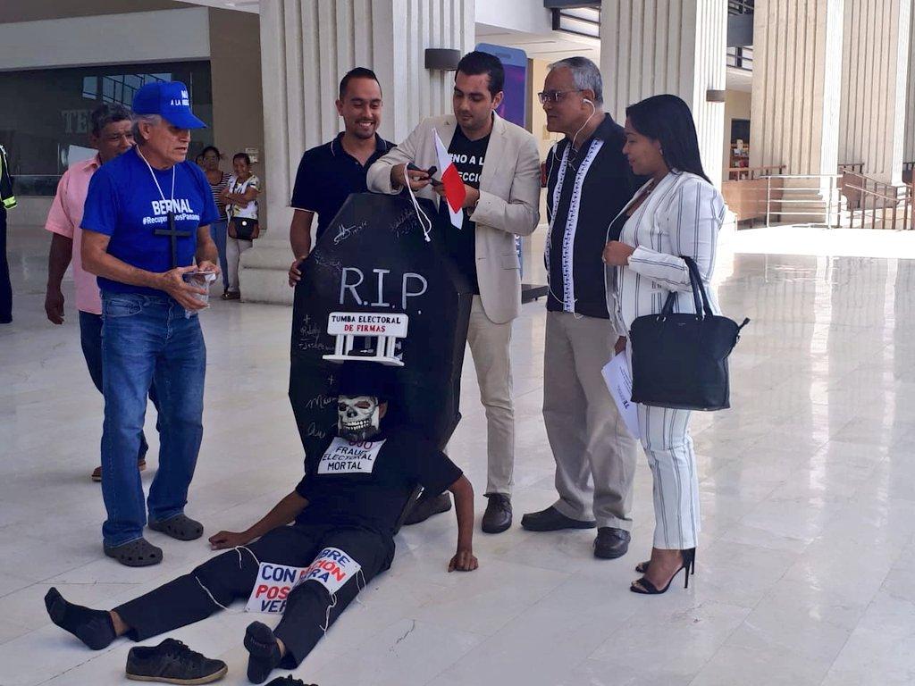 Los manifestantes presentan un cádaver y ataúd con mensajes que dicen: "Tumba Electoral de Firmas", "Ojo Fraude Electoral Mortal y "No a la Reelección"