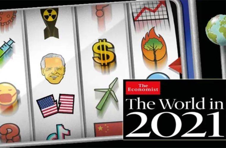 La portada de la revista The Economist, que cada año hace vaticinios de lo que sucederá en un año, presenta al mundo en el 2021 como una máquina tragaperras de Joe Biden, Vacunas, Mascarillas, China y con la imagen del Covid-19 de inicio a fin.