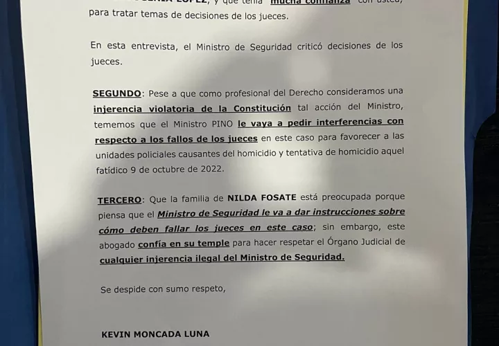 -Que la familia de Nilda Fosate  está preocupada porque piensa que el ministro de Seguridad le va a dar instrucciones sobre cómo deben fallar los jueces en este caso; sin embargo, este abogado confía en nosotros (Moncada-Luna) hacer respetar el Órgano Judicial de cualquier injerencia ilegal del ministro de Seguridad.