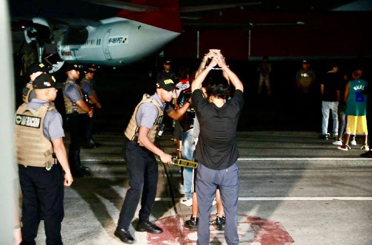 El grupo fue formado a un costado de la pista y cada uno fue revisado con detectores de metal. Son los primeros pasajeros de los vuelos de repatriación de los migrantes que cruzan la selva del Darién, en su ruta hacia Estados Unidos.