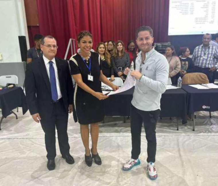 Acompañado por su vicealcalde, Roberto Ruiz Diaz, Mayer Mizrachi recibió su acta de proclamación en la Junta de Escrutinio Distrital Electoral, ubicada en la Universidad Santa María La Antigua.