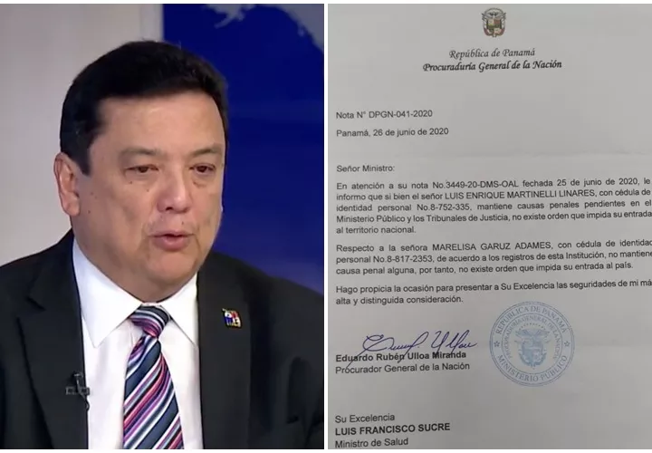 El procurador general de la Nación, Eduardo Ulloa, contestó el 26 de junio una consulta del Ministro de Salud, Luis Sucre, en la que le reafirma que no existe orden que impida la entrada de Luis Enrique Martinelli Linares a territorio nacional.