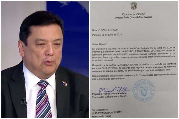 El procurador general de la Nación, Eduardo Ulloa, contestó el 26 de junio una consulta del Ministro de Salud, Luis Sucre, en la que le reafirma que no existe orden que impida la entrada de Luis Enrique Martinelli Linares a territorio nacional.