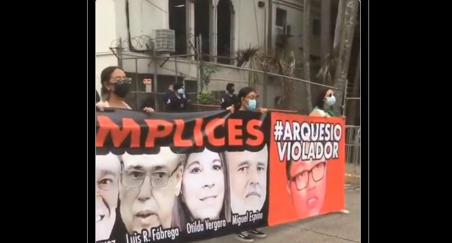 Con pancartas en las que se leían mensajes como "Magistradoscomplices con los rostro de estos y #Arquesioviolador, los manifestaban expresaban su rechazo al fallo que se dio a conocer en horas de la noche del viernes.
