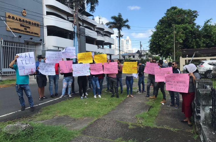 Un grupo de estudiantes protestó ayer frente a la Embajada de #China en #Panamá, localizada en una exclusiva área comercial del país, para exigirle al Gobierno que preside Laurentino Cortizo que no firme un Tratado de Libre Comercio (TLC) con el gigante asiático.