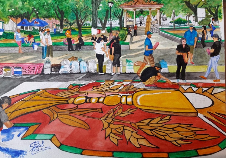 Ángel Santos Barrios es ante todo un cronista que a su paso deja huellas, testimonios de tradiciones y costumbres que mediante trazos coloridos se afana por fijar en el tiempo, lejos del olvido.
