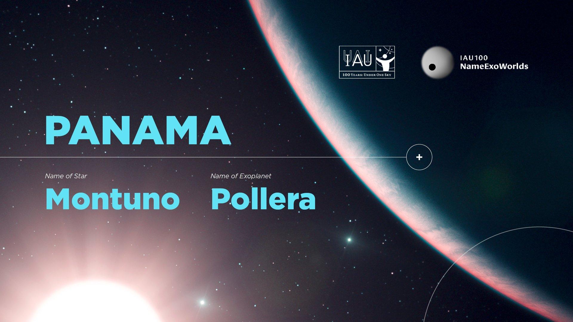 EtiquetasAfter 139 proposals were received for the designated exoplanet system for #Panama, IAU has announced the approved names of Montuno (star) and Pollera (exoplanet).