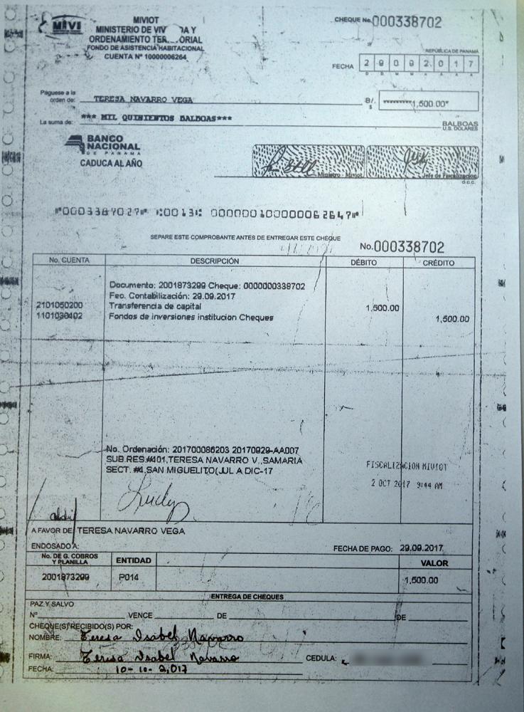 El cheque con numeración 338702 de fecha 29 de septiembre de 2017 por un monto de $1,500 correspondientes a los meses de julio a diciembre, no fue cobrado por la señora Navarro, según indico Ossa, resaltando que en reiteradas ocasiones asistieron a las instalaciones del MIVIOT averiguar del pago y la funcionaria encargada de los pagos les decía que no se había hecho el cheque, incluso hasta que el año fiscal había terminado, por lo que el pago quedaría para el año siguiente.