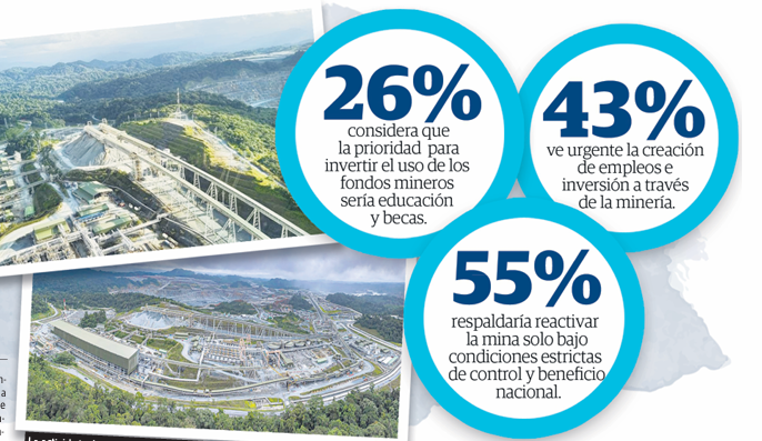 Una encuesta realizada entre el 7 y 13 de julio, destaca que cada vez son más los panameños que avalan la reapertura de la mina, si esta va acompañada de nuevas reglas, más fiscalización y una distribución de los ingresos que genera entre las necesidades más apremiantes de la sociedad.